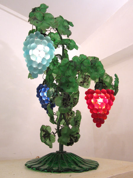 ○イタリア製ムラノガラスの葡萄型ランプ3灯です。伝統的なベネチアンムラノガラスの技法を用いたデザインは繊細かつ流麗で、幻想的な明かりを放つ芸術品です。