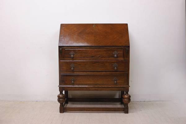 英国製のオーク材のライティングビューローです。閉じればチェスト、開けばデスクとして使えるとっても雰囲気のあるアイテムです。