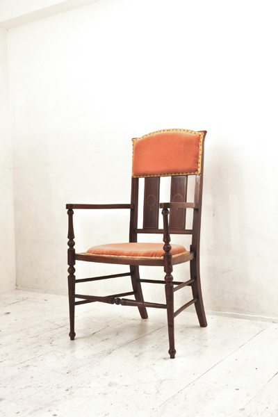 アームや背もたれにはマホガニーのフレームにウォールナット材でインレイ(象嵌細工)が施されています。
