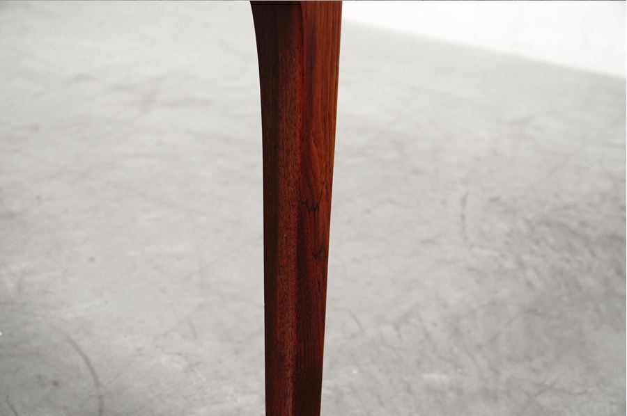外側の直線と内側のアールの対比が美しい、先端に向けてテーパードされた脚部。