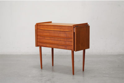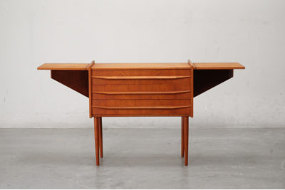 左右にバタフライ式の拡張天板が付いた珍しいプロダクト。細身でテーパードされた脚部など完成されたデンマークデザインがとても魅力的なスモールチェストです。 広げても閉じても使えますので、天板にはランプや観葉植物などを置いてお好きな場所でお使いいただけます。 また3段の引き出しがついていますので、散らかりがちな小物などの整理にも便利です。