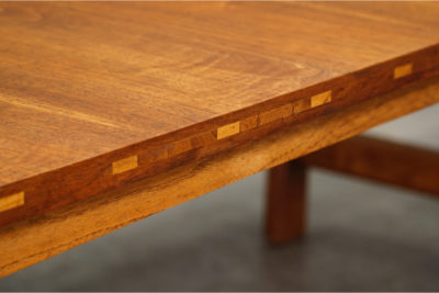 露出した縁の継ぎ目とせりあがった天板のデザインが特徴で、無垢材の杢目がかわいいテーブルです。 天板の形状もわずかにアールを描いて左右が細くなっており、 大きすぎないサイズ感と洗練されたデザインが魅力のテーブルです。
