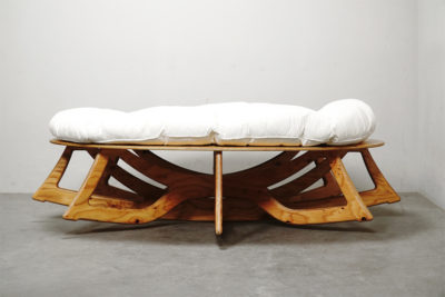 このちょっと珍しい形をしたベッドは、2016年、京都大学総合博物館で開催された「ねむり展 ー眠れるものの文化誌」で注目を浴びたこのベッドは、チンパンジーのベッドをヒントに作られました。