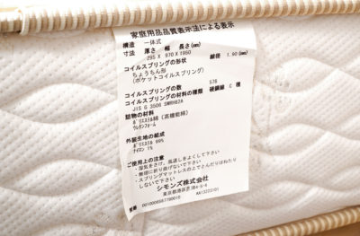マットレスの足元にはこのようなプラスチック製のラベルがあります。お問い合わせの際にはこのラベルをご覧いただくと、おおよその査定などもご案内できる場合があります。