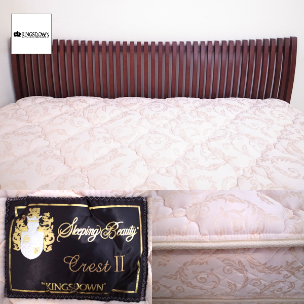 ○最高級ベッド【キングスダウン】の【Crest Ⅱ】ワイドダブルベッドです。33cm厚の非常に厚みのあるマットレスは、やすらかな寝心地を感じることが出来ます。こちらのクレストⅡはダブルクッションにピロートップ。ウォールナットカラーのヘッドボードで、 高級感と安らぎを両立させたワイドダブルベッドは日々の満足のゆく眠りを約束します。