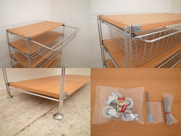 品名:タモ材棚板ステンレスシェルフ5段 スライドバスケット、キャスター付
