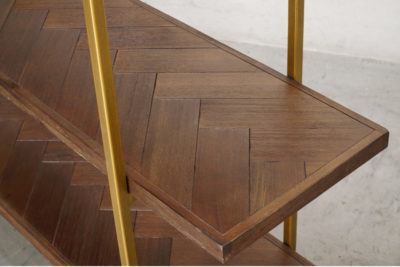 アカシア材をヘリンボーン柄に配置し、艶消しゴールドのスチールフレームで組み合わせた、ヴィンテージスタイルのシェルフ。 オープンタイプですので圧迫感が無く、雑貨やグリーンなどをディスプレイして飾り棚としておすすめです。 また天然木ならではの経年による風合いの変化も楽しめます。