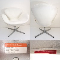 シェルを覆う布または革の張り地の下には合成素材にウレタンフォームのパディングが施され、アルミ製スターベースがその全てを支えます。スワンチェアは受注生産品ですので新品購入時は2~3ヶ月待ちのお品物です。