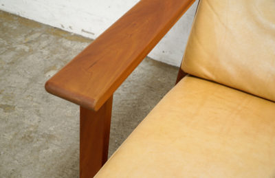 斜めから見るとよくわかりますが、後脚が傾斜しており、深く腰かけることができるのでよりリラックスできるデザインです。北欧の家具によく見られる仕様ですね。