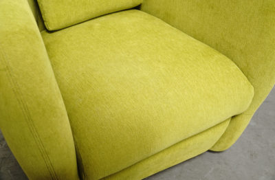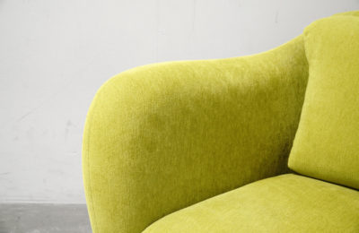 レザーのタイプのソファは経年変化も味わいの一つですが、このようなポップなファブリックソファは使用感が少ないことに越したことはありません。