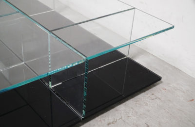 材質:ベース=強化ガラス(ブラック塗装仕上) 天板・バーティカルパネル=クリアーガラス、脚端:グライド
