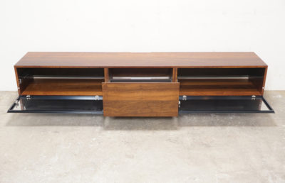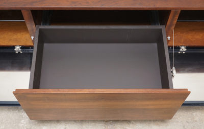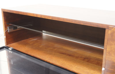 ドロップダウン式の扉の内部も美しい木目です。扉はハーフミラーガラスのドロップダウン式で、扉を閉じたままでも機器のリモコンが使用可能です。